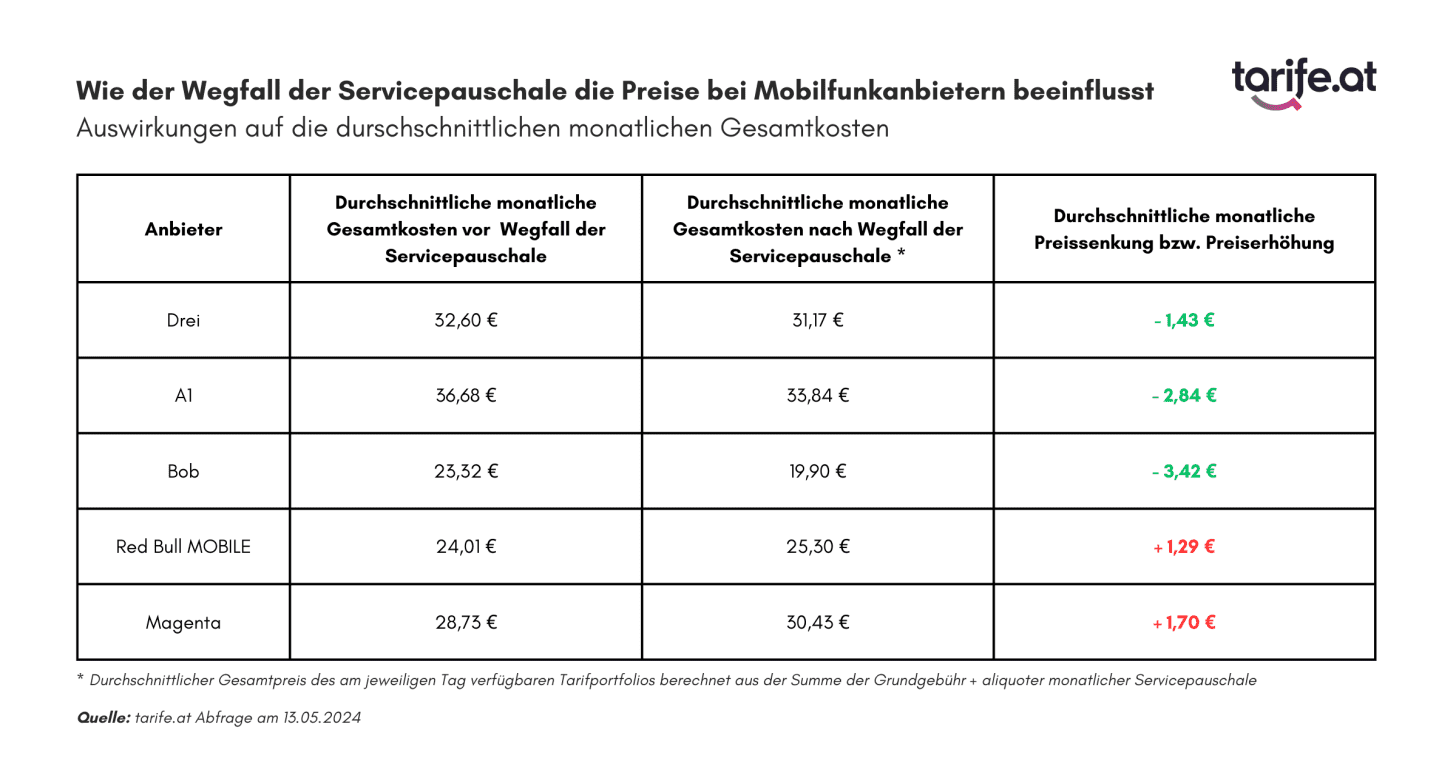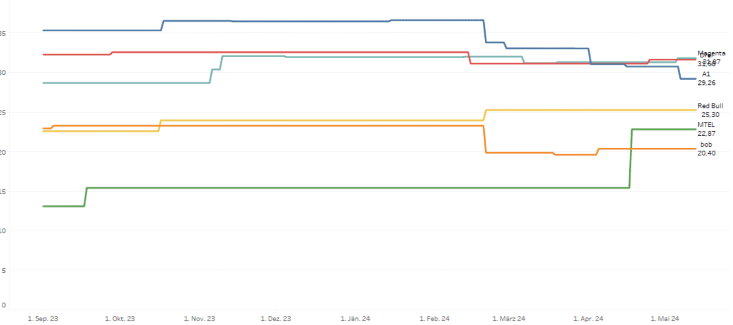 Beim Anbieter Drei reduzierten sich die monatlichen Gesamtkosten im Schnitt um 1,43 Euro. Ebenso führte der Wegfall der Servicepauschale beim Anbieter A1 zu einer durchschnittlichen Senkung der monatlichen Gesamtkosten um 2,84 Euro. Noch signifikanter fiel die Reduktion der durchschnittlichen monatlichen Gebühr beim Anbieter Bob mit minus 3,42 Euro aus. Lediglich Magenta und Red Bull MOBILE verzeichneten einen leichten Anstieg der durchschnittlichen monatlichen Gesamtkosten um plus 1,70 Euro bzw. plus 1,29 Euro.