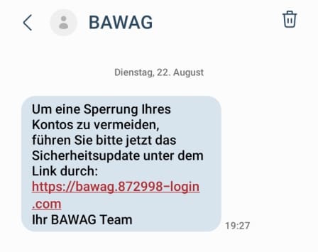 Keine Sorge. Solange Du nicht auf den Link klickst, kann noch nichts passieren. Am besten löscht Du die Fake SMS gleich. Denn durch das reine Lesen von einer SMS entstehen noch keine Kosten oder Schäden.